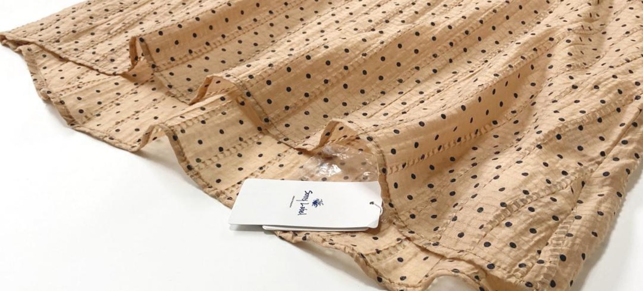 ストライプの透かし柄が入った生地にドットプリントをあしらった、存在感のあるブラウス。