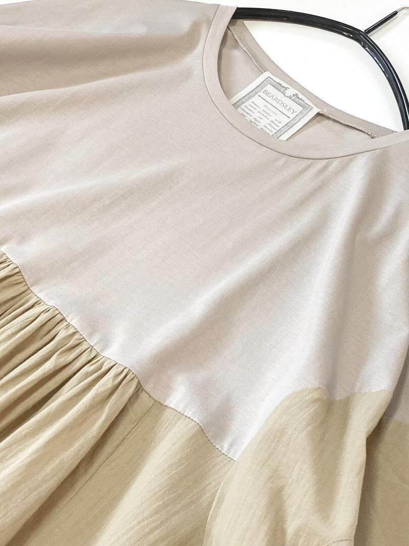 柔らかな風合いの布帛とカットソーを組み合わせた異素材の切替デザインは、1枚でサマになるひと品◎